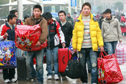 近日,幾名外來務(wù)工者結(jié)伴趕往蘇州 火車站,提前回安徽老家過年。本報記者:王建中