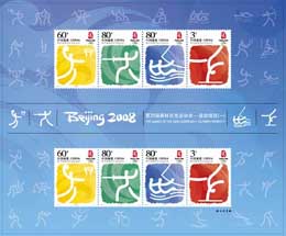 目前已經(jīng)有“會(huì)徽”與“吉祥物”小版張、“會(huì)徽與吉祥物”不干膠小版張、“奧運(yùn)項(xiàng)目”不干膠小版張等郵品上市!皶(huì)徽”與“吉祥物”小版張、“會(huì)徽與吉祥物”不干膠小版張2005年11月12日發(fā)行,自上市以來就在市場中扮演了無可比擬的角色。
