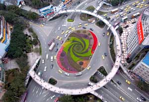 重慶已成為中國西部高樓林立、商業(yè)繁華的大都市,輕軌繞城,高橋縱橫,兩江環(huán)抱中的渝中半島大氣磅礴,山水美景令人心曠神怡。圖為重慶市渝中區(qū)上清寺路口鳥瞰。本報記者 周衡義 攝