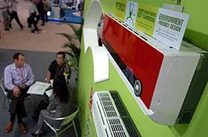4月19日,客商在廣交會(huì)出口展館一家中國(guó)家電企業(yè)的綠色環(huán)?照{(diào)展臺(tái)洽談。在4月15日開幕的第101屆廣交會(huì)上,中國(guó)家電企業(yè)推出一批綠色節(jié)能環(huán)保型家電產(chǎn)品,積極應(yīng)對(duì)歐盟頒布的第三代綠色壁壘——“耗能產(chǎn)品環(huán)保設(shè)計(jì)”指令。新華社記者