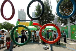 借助奧運契機,沈陽大力推廣全民健身活動,為全市體育產(chǎn)業(yè)發(fā)展提供更廣闊的空間。圖為在“奧運家庭進行時”全國大型家庭體育暨民間游戲展示活動中,市民在沈陽市中山公園參加“家庭球類三項賽”。(本報資料照片) | 沈陽是2008年奧運會足球賽區(qū)之一,并有可能成為中國國奧足球隊的主場。隨著北京奧運會開幕日期的臨近,沈陽各個行業(yè)正積極籌劃挖掘奧運“金礦”,在奧運競技場的背后,一個經(jīng)濟大舞臺也同時在這個中國足球的福地上搭建起來。奧運前后,沈陽將從中得到多少商機呢?
