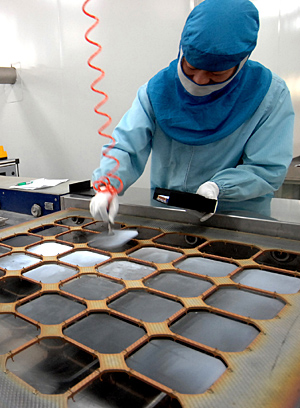 8月23日,無(wú)錫前洲印染有限公司成功轉(zhuǎn)型發(fā)展建立的無(wú)錫尚品太陽(yáng)能電力科技有限公司的工人在太陽(yáng)能電池生產(chǎn)流水線上操作。 無(wú)錫市最近規(guī)定,除了完善城鄉(xiāng)污水處理系統(tǒng)、減少湖面養(yǎng)殖、再造湖濱濕地等措施外,城區(qū)內(nèi)所有規(guī)模以下的“五小”企業(yè)一律關(guān)閉,同時(shí)大力整治“三高兩低”企業(yè)。 | |