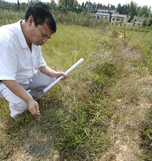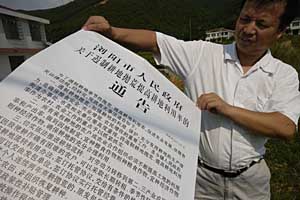 | 瀏陽市工作人員展示一張有關(guān)遏制耕地拋荒的政府通告。 |
