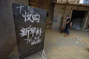 | 位于洞庭湖糧食主產(chǎn)區(qū)的益陽市赫山區(qū)蘭溪米市是全國(guó)十大米市之一,號(hào)稱“湖南米市晴雨表”。圖為掛出的早稻收購(gòu)價(jià)牌子。 |