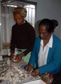 南非農(nóng)村婦女們10月4日正在南非東南部祖魯王國山區(qū)夸丁迪村包裝加工自己種植的蘑菇。 福建農(nóng)林大學(xué)的中國菌草蘑菇專家林占熺教授2005年1月把菌草蘑菇栽培技術(shù)和旱稻技術(shù)引入祖魯王國,在窮山溝建立五萬平方米的蘑菇基地,與村民一起建起了1500平方米的蘑菇大棚。目前正在建設(shè)工廠化的蘑菇菌袋車間,其規(guī)模為年產(chǎn)100萬袋,產(chǎn)值達(dá)1000萬蘭特(約145萬美元),為450人提供就業(yè)機(jī)會。 |