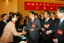 10月16日,胡錦濤同江蘇代表團代表一起審議黨的十七大報告。這是胡錦濤同來自基層的代表親切交談。 新華社記者:樊如鈞