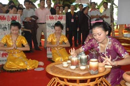 首屆瀾滄江·湄公河次區(qū)域農(nóng)產(chǎn)品暨第十屆西雙版納邊境貿(mào)易旅游交易會(huì)日前在云南省景洪市開幕。本次交易會(huì)包括中外旅游推介會(huì)、中外商品展銷等活動(dòng),吸引了緬甸、老撾、泰國(guó)、馬來西亞等58個(gè)外國(guó)參展團(tuán)前來參加。圖為幾位姑娘在向參展觀眾表演茶藝。 |