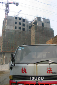 鄭州市行政執(zhí)法局用車輛堵住“帝湖花園”施工現(xiàn)場入口,以防止其繼續(xù)進(jìn)料施工。新華社記者:梁鵬