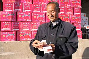 | 陜西洛川縣槐柏鎮(zhèn)度谷村果農(nóng)清點領到的保險賠款。新華社記者 張軍