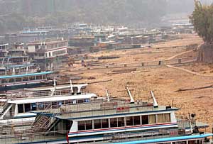 | 桂林陽朔碼頭上停靠的因漓江水位下降被迫暫時(shí)停航的游船。新華社記者 陳瑞華