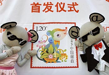 | 工作人員裝扮的卡通“酷鼠”在《戊子年》生肖郵票南京首發(fā)式現(xiàn)場表演。新華社記者 孫參
