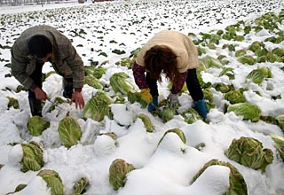 | “蔬菜之鄉(xiāng)”湖北省嘉魚縣組織菜農(nóng)及時采摘蔬菜,向武漢、廣東等大城市配送,保證市民雪后的蔬菜供應(yīng)。新華社記者 余國慶