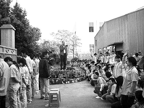 張全收拿著喇叭正發(fā)動員工投票選舉農(nóng)民工主管 |