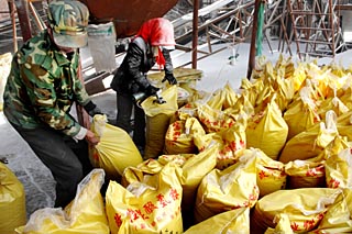 | 寧夏賀蘭縣化肥廠工人在生產(chǎn)車間包裝碳酸氫氨。新華社記者 李紫恒