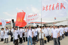 5月13日,由103名醫(yī)護(hù)人員組成的江蘇省醫(yī)療隊奔赴四川地震災(zāi)區(qū),并隨機(jī)帶去5噸多藥品、器械等醫(yī)療物資以及20萬毫升血液。