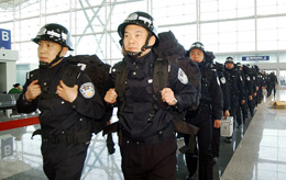 5月13日中午12點,200名天津特警及兩名隨隊醫(yī)生攜帶照明、破拆和通訊工具,飛赴四川重災(zāi)區(qū),開展搶險救援工作。