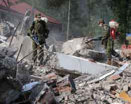5月19日,成都軍區(qū)防化團(tuán)官兵在地震中變成一片廢墟的北川中學(xué)噴灑消毒藥劑。新華社記者:陳樹(shù)根