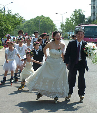 | 6月15日,黑龍江省牡丹江市的逯璐與哈爾濱姑娘王詩洋喜結(jié)良緣,倆人選擇了時尚、環(huán)保的“輪滑”婚禮。新華社發(fā)(莊文斌