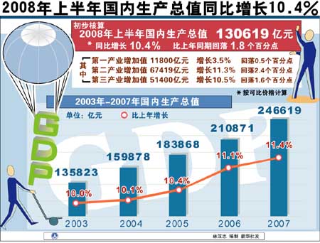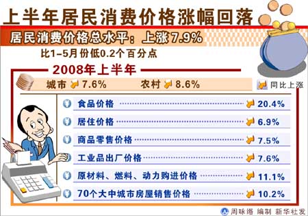 “第一是國際因素”,李曉超在上半年國民經(jīng)濟運行情況新聞發(fā)布會上說。今年以來,世界各國價格可以說是普遍上漲。近兩個月,包括發(fā)達國家、發(fā)展中國家的CPI都在沖高,有些達到了十多年以來的較高水平。 同時,國際初級產(chǎn)品特別是石油和糧食的價格,今年以來增長都在30%以上。據(jù)有關國際組織統(tǒng)計,6月份國際能源價格環(huán)比上漲8%。其中,石油上漲7.2%,煤炭上漲19.9%。在我國開放度越來越大的形勢下,國際因素的影響是非常大的。 第二,生產(chǎn)價格漲幅繼續(xù)擴大,對CPI也形成了較大的傳導壓力。5月份工業(yè)品出廠價格上漲了8.2%,6月份漲幅進一步擴大到8.8%。而近期成品油和電價的上調,災后重建形成對建材的需求,都可能形成價格上漲的一些新因素! 第三,通貨膨脹預期還比較強。雖然近兩個月隨著居民消費價格水平的回落,社會公眾對價格上漲的預期比前一段較為穩(wěn)定,但在當前國內外特別是國外價格上漲較快的形勢下,社會公眾容易產(chǎn)生價格繼續(xù)上漲的預期。 第四,下半年價格上漲的翹尾因素還比較高。據(jù)初步測算,下半年價格翹尾因素將影響居民消費價格上漲1.8個百分點。 數(shù)字表明,上半年我國居民消費價格漲幅回落,CPI同比上漲7.9%,比1至5月份低0.2個百分點。其中,6月份上漲7.1%,比上月回落0.6個百分點,環(huán)比下降0.2%。