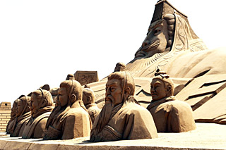 | 寧夏沙湖風(fēng)景區(qū)邀請(qǐng)沙雕藝人就地取材,把一座座黃沙丘變成了一組組精美的沙雕作品,吸引了海內(nèi)外眾多游客的目光。 | 向沙漠要效益