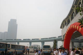8月31日,多輛公交車正通過高架橋駛往廈門市快速公交1號線起點站第一碼頭站。 當日,廈門市快速公交系統(tǒng)正式開通,廈門市區(qū)交通擁堵問題將大為緩解。廈門市快速公交系統(tǒng)通過在鬧市區(qū)建設高架橋,實現(xiàn)了快速公交的專有路權,全程不設紅綠燈,從而保障了快速公交車的暢行和準點。據(jù)悉,這是目前國內首個采取高架橋模式的快速公交系統(tǒng),走出了一條有別于地面專用公交車道和地鐵、輕軌、符合中等城市實際的公交之“道”。 |