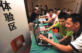 浙江啟動“百場萬企”電子商務(wù)系列培訓(xùn)。9月10日,工作人員(前右二、右四)在培訓(xùn)浙江的中小企業(yè)負責(zé)人運用網(wǎng)絡(luò)做生意。新華社記者:譚進