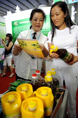 西部少數(shù)民族特產(chǎn)勇闖中博會。9月23日,來自貴州省綠原食品開發(fā)有限公司的業(yè)務(wù)員在展會上向客商推介野生刺梨果汁。新華社記者:周文杰