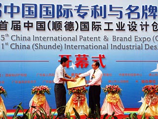 | 國家工業(yè)設(shè)計與創(chuàng)意產(chǎn)業(yè)基地9月落戶廣東順德。廣東佛山順德區(qū)副區(qū)長蘇偉波(左)從國家知識產(chǎn)權(quán)據(jù)副局長張勤(右)手中接過“國家工業(yè)設(shè)計與創(chuàng)意產(chǎn)業(yè)(順德)基地”牌匾。本報記者