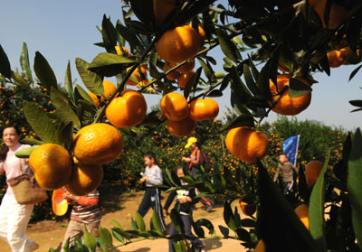 當(dāng)日,2008廣西(柳城)生態(tài)蜜桔文化節(jié)暨新農(nóng)村科技大集開(kāi)幕,吸引眾多游人前往觀光采購(gòu),助農(nóng)增收。新華社發(fā)(李斌