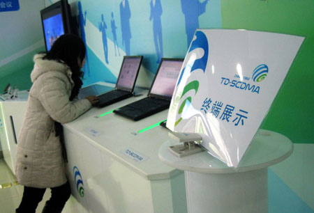 1月7日,消費(fèi)者在北京一家中國移動展廳體驗3G手機(jī)的上網(wǎng)功能。新華社記者:邢廣利
