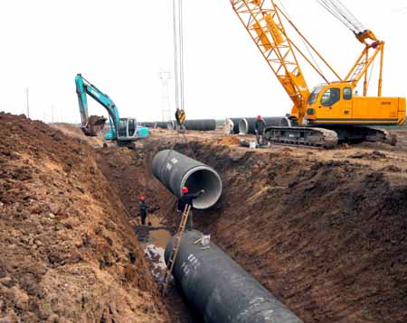 1月7日,在安徽省淮北市李槽坊站站場(chǎng)南側(cè),施工人員將最后一根管道吊裝入位。 當(dāng)日,全長(zhǎng)89公里的“淮水北調(diào)”工程輸水管道全線貫通,并有望在春節(jié)前調(diào)試供水!盎此闭{(diào)”工程自淮河支流淮洪新河取水,出水口位于安徽省濉溪縣臨渙塌陷區(qū),工程建成后將緩解宿州、淮北兩市新增工業(yè)用水壓力并兼顧沿線農(nóng)業(yè)灌溉和生態(tài)用水。 |