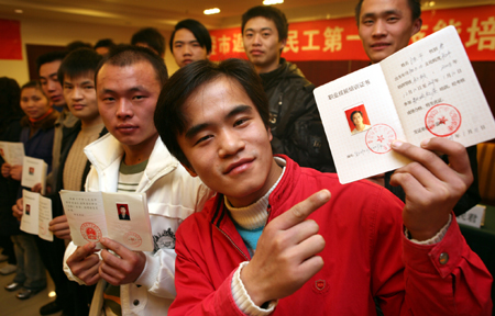 四川返鄉(xiāng)民工參加“訂單培訓”再就業(yè)。1月12日上午,四川華鎣市接受職業(yè)技能培訓的返鄉(xiāng)農(nóng)民工高興地領到培訓證書。他們將帶著一技之長,按“訂單”分赴各自的工作崗位再就業(yè)。新華社發(fā)(邱海鷹