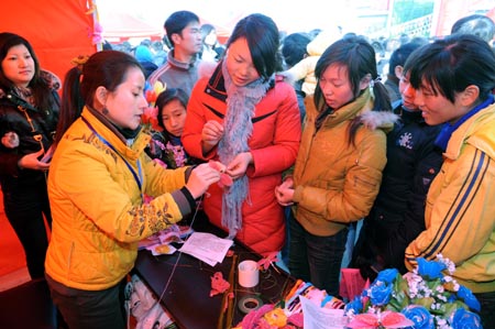 節(jié)前送崗位,過年也安心。1月14日——15日,江西東鄉(xiāng)縣勞動就業(yè)部門組織舉辦了返鄉(xiāng)農(nóng)民工專場招聘會。剛從廣東東莞返鄉(xiāng)的胡霞(右四)等正在南昌唯美創(chuàng)意絲網(wǎng)花招聘臺前學做絲網(wǎng)花。新華社記者:宋振平