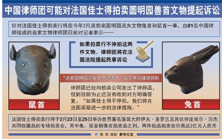 針對法國佳士得拍賣行將在今年2月底拍賣圓明園流失文物兔首和鼠首一事,由81名中國律師組成的追索文物律師團日前對記者表示,如果拍賣行不停拍這兩件文物,律師團將在法國法院提起民事訴訟。 這個“追索圓明園流失文物律師團”成員李興鋒律師說,律師團已經(jīng)向拍賣公司發(fā)出了律師函,但到目前為止還沒有收到對方明確答復。“如果佳士得不停拍,我們將在法國采取進一步的法律措施! 事實上,律師團自今年1月成立以來在追索兔首和鼠首文物一事上可謂一波三折。起先,根據(jù)法國法律規(guī)定,原告需要與事實有利害關系,律師團一直沒有找到合適的原告。等確定全球愛新覺羅家族宗親會為原告后,所涉及的高額訴訟費以及法院審判需要支付的補償金又沒了著落。近日,一家房地產(chǎn)公司表示愿意出資40萬元支持追索行動,律師團的工作才得以繼續(xù)。 據(jù)了解,法國佳士得拍賣行將于2月23日至25日舉辦世界著名服裝大師伊夫·圣羅蘭及其伙伴皮埃爾·貝杰共同收藏品的專場拍賣會,其中兔、鼠首銅像在拍賣品之列,兩件拍品拍賣估價高達2億元人民幣。 此前有報道稱國家文物局博物館司司長宋新潮表示反對回購。他認為既然是中國的東西,就沒有必要用中國的錢買回來。這兩件文物都是由于戰(zhàn)爭原因被掠奪到海外的文物,根據(jù)國際公約,要在道義上進行呼吁和追溯,希望其返還。對于追回方式,他首先不希望通過拍賣,其次要尊重收藏家意愿,通過相應的補償以回贈方式追回,同時也歡迎和鼓勵通過捐贈的方式促成回歸。 李興鋒說:“不管這次追索結果如何,現(xiàn)在可以看到中國公眾對這件事的強烈關注,激起了人們通過法律手段實現(xiàn)保護國家財產(chǎn)的熱情和認識,這將為我們今后追索流失文物提供有利經(jīng)驗!