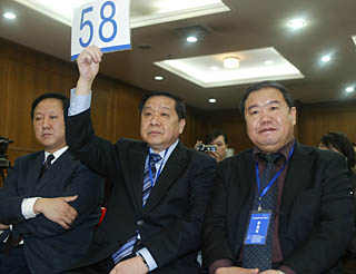 | 3月4日,北京三元集團有限責(zé)任公司與河北三元食品有限公司組成的聯(lián)合競拍體代表在“三鹿集團”破產(chǎn)首次拍賣會上舉牌競拍。新華社發(fā)(丁立新