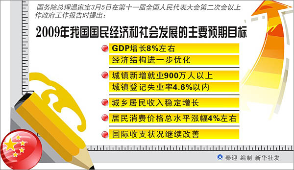 政府工作報告提出2009年中國經(jīng)濟(jì)增長預(yù)期目標(biāo)為8%左右。這也是中國政府連續(xù)五年將經(jīng)濟(jì)增速目標(biāo)設(shè)定為這一數(shù)字。但今年這一目標(biāo),卻格外不尋常。 在國際金融危機(jī)尚未見底,世界各大權(quán)威機(jī)構(gòu)對全球經(jīng)濟(jì)增長預(yù)測悲觀,主要經(jīng)濟(jì)體將會出現(xiàn)負(fù)增長的背景下,人們十分關(guān)心中國經(jīng)濟(jì)能否順利達(dá)到這一目標(biāo)。 “經(jīng)濟(jì)增長的周期性調(diào)整與國際金融危機(jī)影響相疊加,導(dǎo)致我國經(jīng)濟(jì)下行壓力加大。8%左右,是一個要通過努力才能實現(xiàn)的目標(biāo)!比珖舜蟠怼|北財經(jīng)大學(xué)校長艾洪德說,“只有這樣才能創(chuàng)造必需的就業(yè)機(jī)會,才能實現(xiàn)經(jīng)濟(jì)社會的良性運轉(zhuǎn)。” 2008年第四季度中國經(jīng)濟(jì)增速下滑到了6.8%,中國經(jīng)濟(jì)面臨嚴(yán)峻考驗。不過,憑借中國經(jīng)濟(jì)堅實的發(fā)展基礎(chǔ)、廣闊的內(nèi)需市場、穩(wěn)健的金融體系、有力的宏觀調(diào)控舉措,接受記者采訪的代表、委員都對中國經(jīng)濟(jì)發(fā)展有著堅定的信心。 全國人大代表、中國人民銀行濟(jì)南分行行長楊子強(qiáng)相信:“中國經(jīng)濟(jì)有望在本輪經(jīng)濟(jì)衰退中率先復(fù)蘇”。但他提醒說,當(dāng)前一些經(jīng)濟(jì)指標(biāo)有好轉(zhuǎn)跡象,但這并不足以表明經(jīng)濟(jì)觸底回暖。“今年六七月份將會是一個重要觀測窗口”。 全國政協(xié)委員、財政部財科所所長賈康預(yù)測,如果處理得好,中國經(jīng)濟(jì)增速今年會呈現(xiàn)前低后高走勢。但也要做好防范國際經(jīng)濟(jì)形勢進(jìn)一步惡化的預(yù)案。