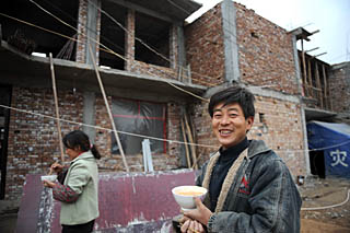 這是2008年11月21日,甘肅省隴南市武都區(qū)馬街鎮(zhèn)“感恩村”村民李旭德(右)在自家正在建設的二層小樓房前吃午飯。新華社記者 聶建江