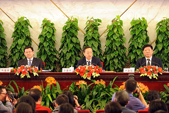 | 3月10日,十一屆全國人大二次會議舉行記者會,工業(yè)和信息化部部長李毅中、人力資源和社會保障部部長尹蔚民、商務(wù)部部長陳德銘答記者問。新華社記者
