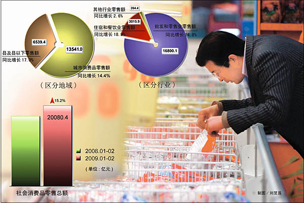 國(guó)家統(tǒng)計(jì)局12日公布,今年1至2月,社會(huì)消費(fèi)品零售總額20080.4億元,同比增長(zhǎng)15.2%。增長(zhǎng)幅度較去年同期下降5個(gè)百分點(diǎn),較去年全年下降6.4個(gè)百分點(diǎn),經(jīng)過(guò)自2007年12月起13個(gè)月超過(guò)20%的高增長(zhǎng)后,首次回落至20%以下。 具體指標(biāo)也可謂是全線(xiàn)下跌:城市消費(fèi)品零售額13541.0億元,同比增長(zhǎng)14.4%,增幅分別較去年同期下降6.4個(gè)百分點(diǎn),較去年全年下降7.7個(gè)百分點(diǎn);縣及縣以下零售額6539.4億元,增長(zhǎng)17%,增幅分別下降1.9個(gè)百分點(diǎn)和3.7個(gè)百分點(diǎn);批發(fā)和零售業(yè)零售額16800.1億元,同比增長(zhǎng)14.8%,增幅下降5.2個(gè)百分點(diǎn)和6.7個(gè)百分點(diǎn);住宿和餐飲業(yè)零售額3015.9億元,增長(zhǎng)18.9%,增幅下降4.2個(gè)百分點(diǎn)和5.8個(gè)百分點(diǎn)。 不過(guò)從結(jié)構(gòu)上看,縣及縣以下消費(fèi)品零售額同比增長(zhǎng)幅度快于城市,是近一年多來(lái)的首次。 分商品類(lèi)別看,限額以上批發(fā)和零售業(yè)吃、穿、用商品類(lèi)零售額同比分別增長(zhǎng)14.2%、15.9%和7.6%。其中,糧油類(lèi)增長(zhǎng)16.3%,肉禽蛋類(lèi)增長(zhǎng)12.0%,服裝類(lèi)增長(zhǎng)17.4%,文化辦公用品類(lèi)增長(zhǎng)8.3%,體育、娛樂(lè)用品類(lèi)增長(zhǎng)13.5%,日用品類(lèi)增長(zhǎng)12.0%,家用電器和音像器材類(lèi)增長(zhǎng)2.7%,家具類(lèi)增長(zhǎng)27.1%,化妝品類(lèi)增長(zhǎng)14.6%,金銀珠寶類(lèi)增長(zhǎng)16.3%,汽車(chē)類(lèi)增長(zhǎng)9.3%,石油及制品類(lèi)增長(zhǎng)0.7%,建筑及裝潢材料類(lèi)增長(zhǎng)22.4%,通訊器材類(lèi)下降9.2%。