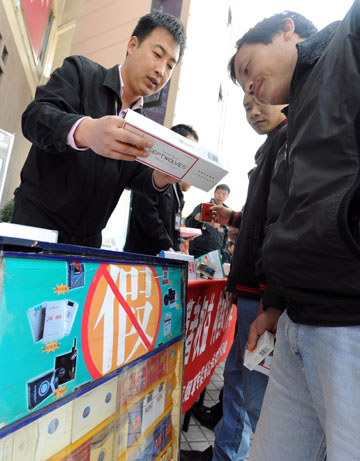 3月15日,福州市煙草專賣局工作人員(左)在向市民講解如何辨別真假香煙。當日,福州市開展“3·15”國際消費者權益日活動,一些專業(yè)人員現(xiàn)場教授消費者如何辨別假冒偽劣產(chǎn)品,受到市民的廣泛歡迎。新華社記者