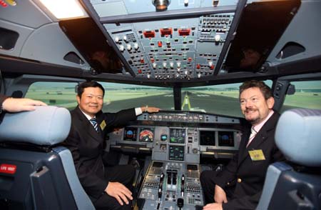 近日,中國(guó)民航局購(gòu)買(mǎi)的首臺(tái)空中客車(chē)A320全動(dòng)模擬機(jī)在華歐航空培訓(xùn)中心新樓投入運(yùn)營(yíng)。該模擬機(jī)可動(dòng)態(tài)模擬飛行實(shí)況,將被用來(lái)培訓(xùn)中國(guó)民航局的飛行監(jiān)察員以及各航空公司的飛行員、機(jī)械師和乘務(wù)員。 圖為在位于北京的華歐航空培訓(xùn)中心,嘉賓在體驗(yàn)新投入運(yùn)營(yíng)的空中客車(chē)A320全動(dòng)模擬機(jī)。新華社記者:侯俊