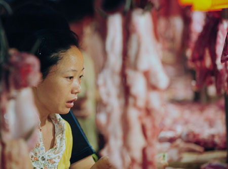 5月7日,顧客在廣州橫滘農(nóng)貿(mào)市場(chǎng)選購(gòu)豬肉。新華社記者:陳曄華