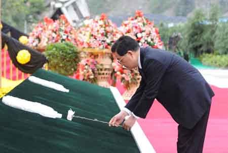 5月12日,紀念四川汶川特大地震一周年活動在汶川縣映秀鎮(zhèn)隆重舉行。紀念活動上,胡錦濤總書記深情俯下身子,將一枝潔白的菊花敬獻在四川汶川特大地震記事墻前,深切思念在地震中不幸罹難的同胞和在抗震救災(zāi)斗爭中英勇獻身的烈士。新華社記者:李學(xué)仁 攝
