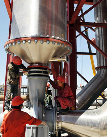 由寧夏石嘴山市引進(jìn)資金3.88億元建設(shè)的6000噸番茄加工項(xiàng)目進(jìn)展順利。目前,這一項(xiàng)目已完成投資0.58億元。項(xiàng)目完成后可日處理番茄6000噸,將有力促進(jìn)農(nóng)業(yè)產(chǎn)業(yè)化發(fā)展,拉動(dòng)農(nóng)民增收。圖為技術(shù)人員在安裝設(shè)備。