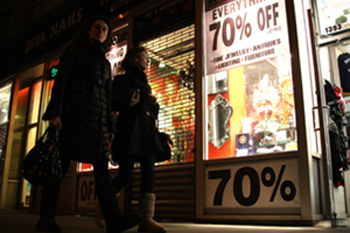 美國聯(lián)邦儲備委員會3月發(fā)表報告說,自今年初以來美國經(jīng)濟總體仍持續(xù)惡化,短時間內(nèi)難以好轉(zhuǎn),到2009年底或2010年初才可能出現(xiàn)明顯復(fù)蘇。行人從美國紐約一家商店的打折廣告旁走過。新華社記者劉欣