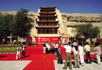 千年之后,隨著中國的西部開發(fā)和交通的日趨便利,在敦煌文化藝術(shù)的感召下,越來越多的人來到敦煌旅游,敦煌在國際旅游市場上知名度越來越大。敦煌研究院的一項統(tǒng)計顯示,從1979年開放以來,截至2008年,已經(jīng)有80多個國家和地區(qū)的580多萬游客參觀了敦煌莫高窟。