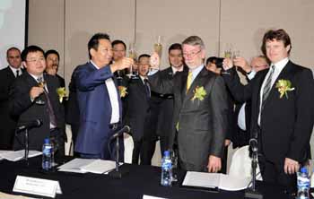 10月19日,四川漢龍(集團)有限公司與澳大利亞鉬礦有限公司在香港正式簽署股權(quán)認購及合作開發(fā)框架協(xié)議。漢龍礦業(yè)出資2億美元,收購澳大利亞鉬礦有限公司55.3%股權(quán),成為其控股股東,并通過融資方式提供5億美元資金開發(fā)澳大利亞鉬礦有限公司全資擁有的世界級大型鉬銅伴生礦SpinifexRidge項目。新華社記者 宋振平 攝 |
