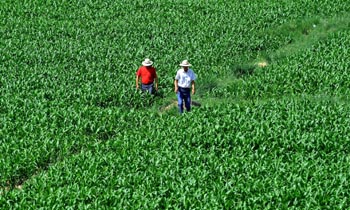 技術人員查看張掖市甘州區(qū)制種玉米的生長情況。本報記者 韓傳號