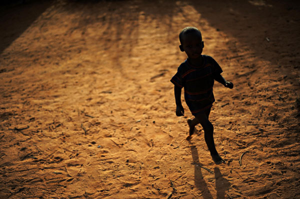 在索馬里邦特蘭省的塔瓦凱難民營,一名索馬里兒童在沙地上玩耍。新華社/法新