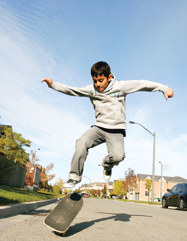 在加拿大多倫多,愛問問題的路易斯在住所附近玩滑板。新華社發(fā)(鄒崢 攝)
